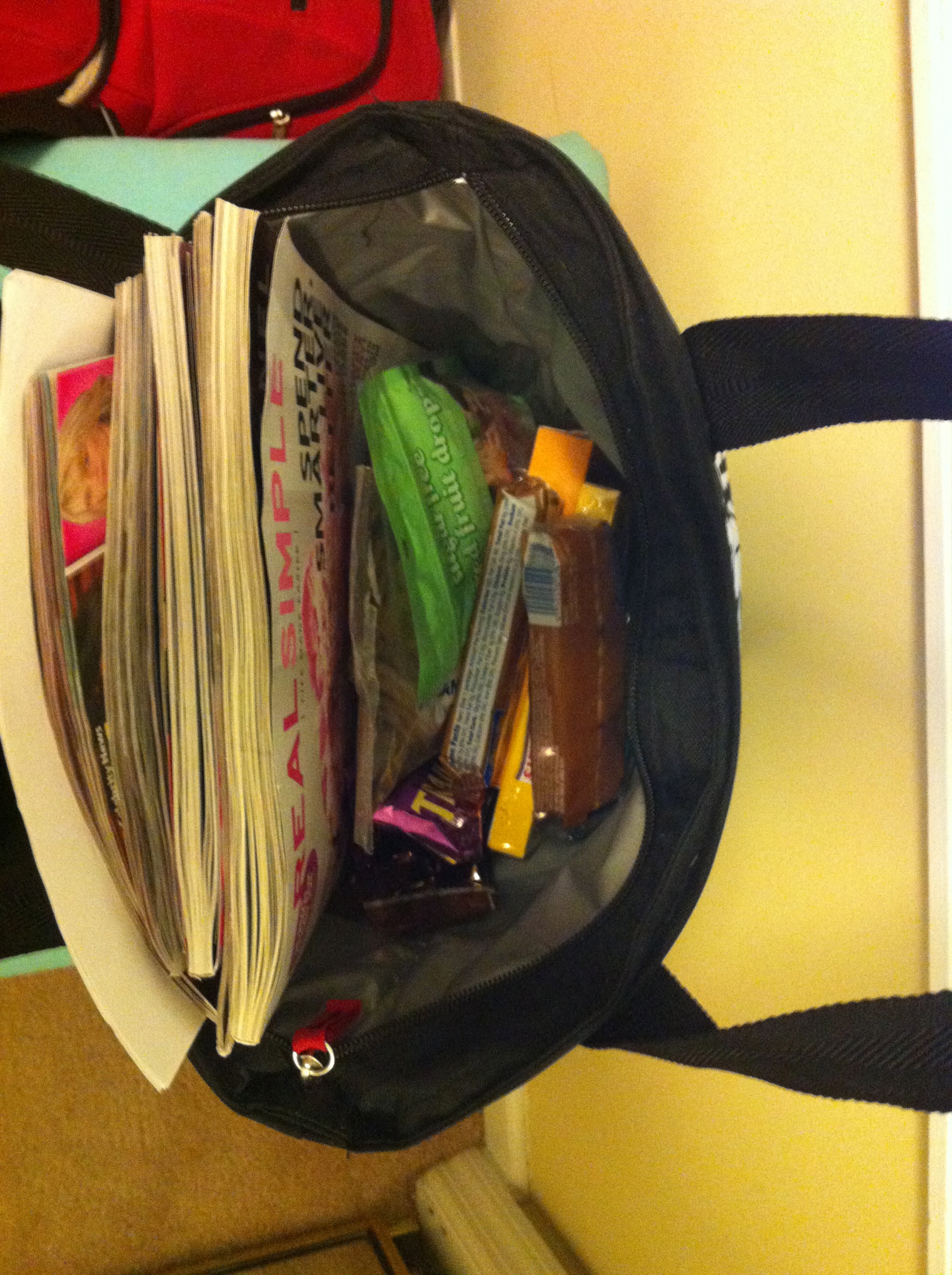 – I also have a little bag filled with snacks, magazines, pens and stuff. *I need to remember to put chargers for the ipads and phones in there!!!