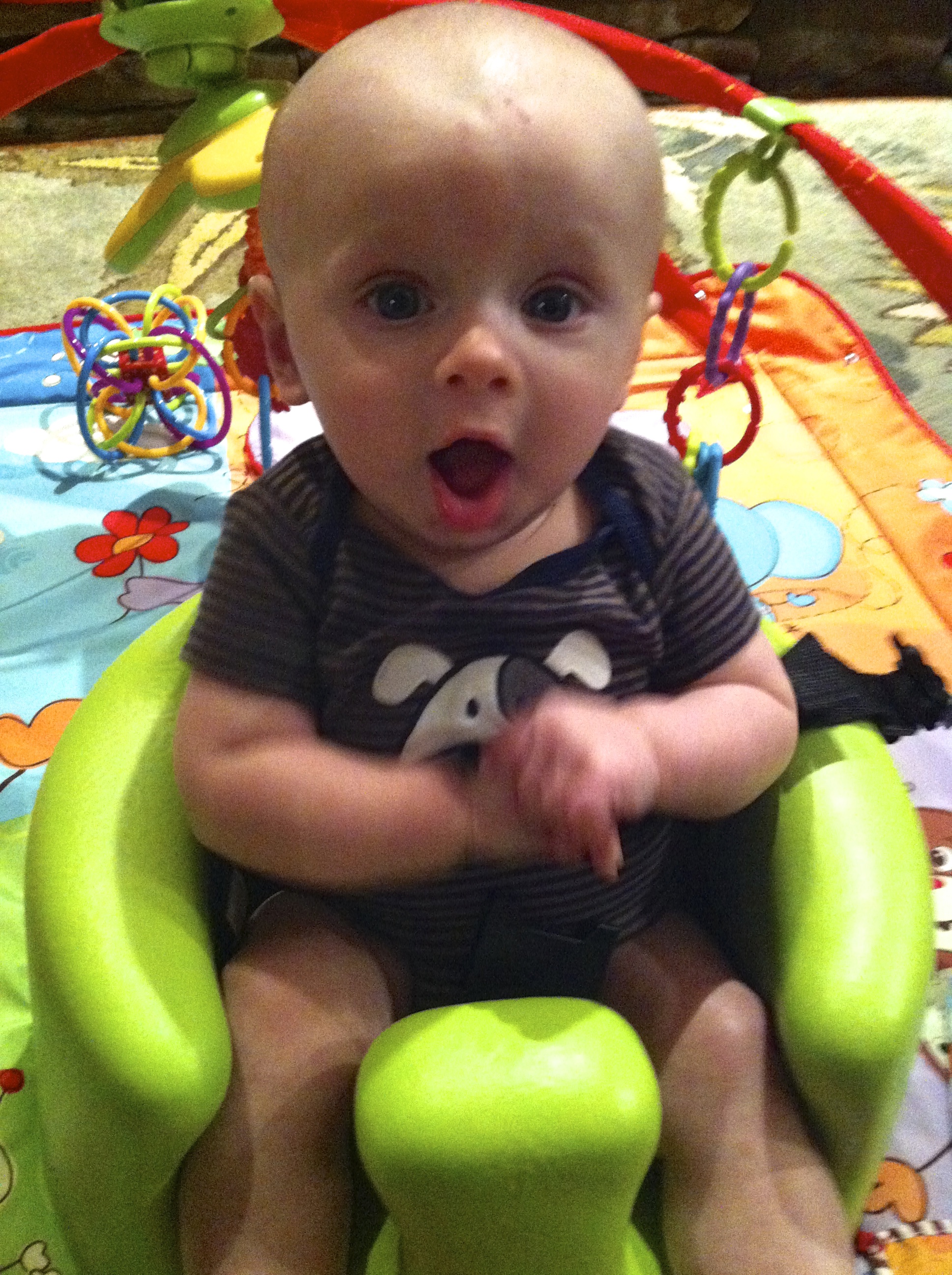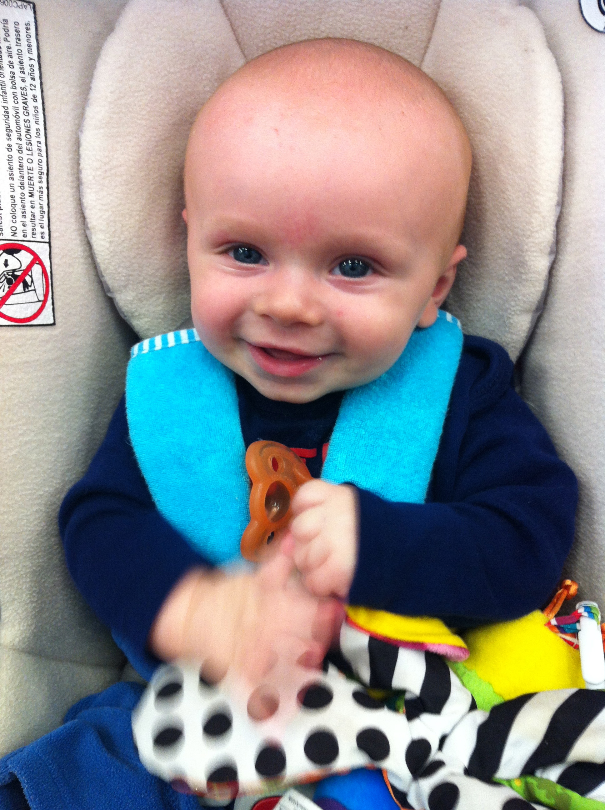 Smile :). He loves flashing his big gummy grin. He smiles a lot and has started a small giggle. He’s not laughing out loud too often; he has more of a little snicker. It’s pretty funny to hear.