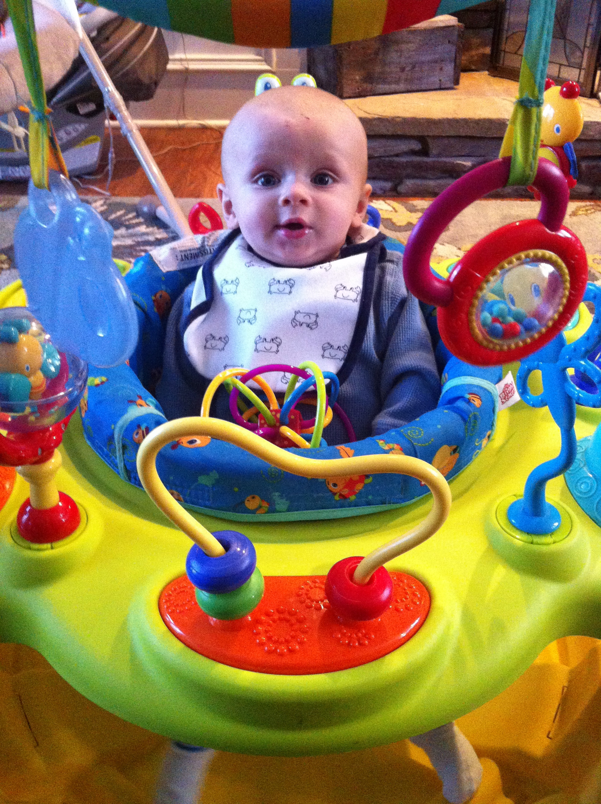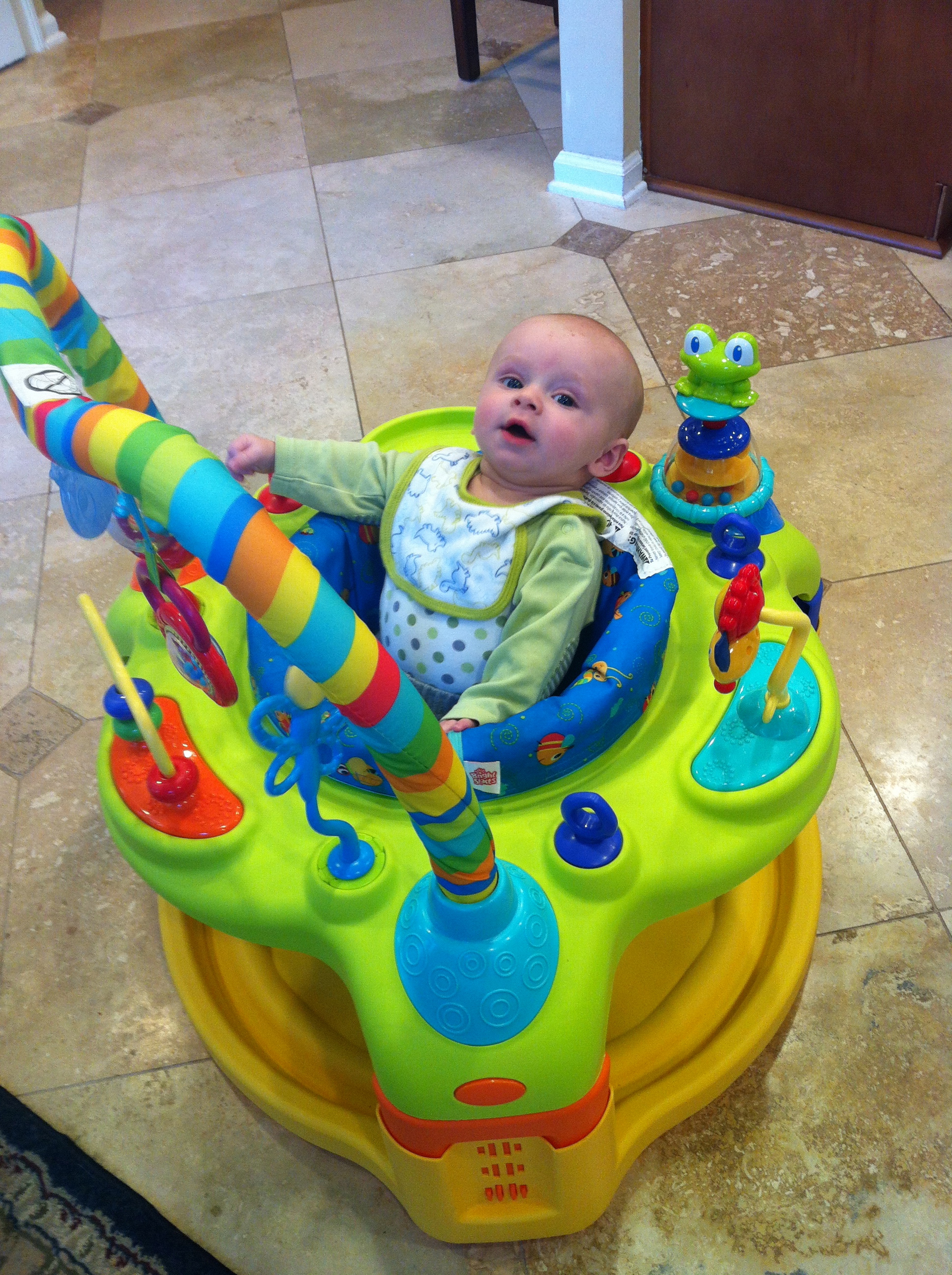 He loves to play and stand in his activity gym and Johnny jump up. I put him in his Johnny Jump Up a few weeks ago! I think once he realized he was standing, he really liked it. You can’t put him in it when he is tired (AT ALL), but when he is in a good mood, he likes to hang around in it. He likes the activity gym as well, but he can’t reach the toys yet. You can tell he is concentrating on how he will eventually get to them. He’ll figure it out soon enough! He has to figure out that it’s ok to lean forward. Right now he likes to lean WAY back! LOL
