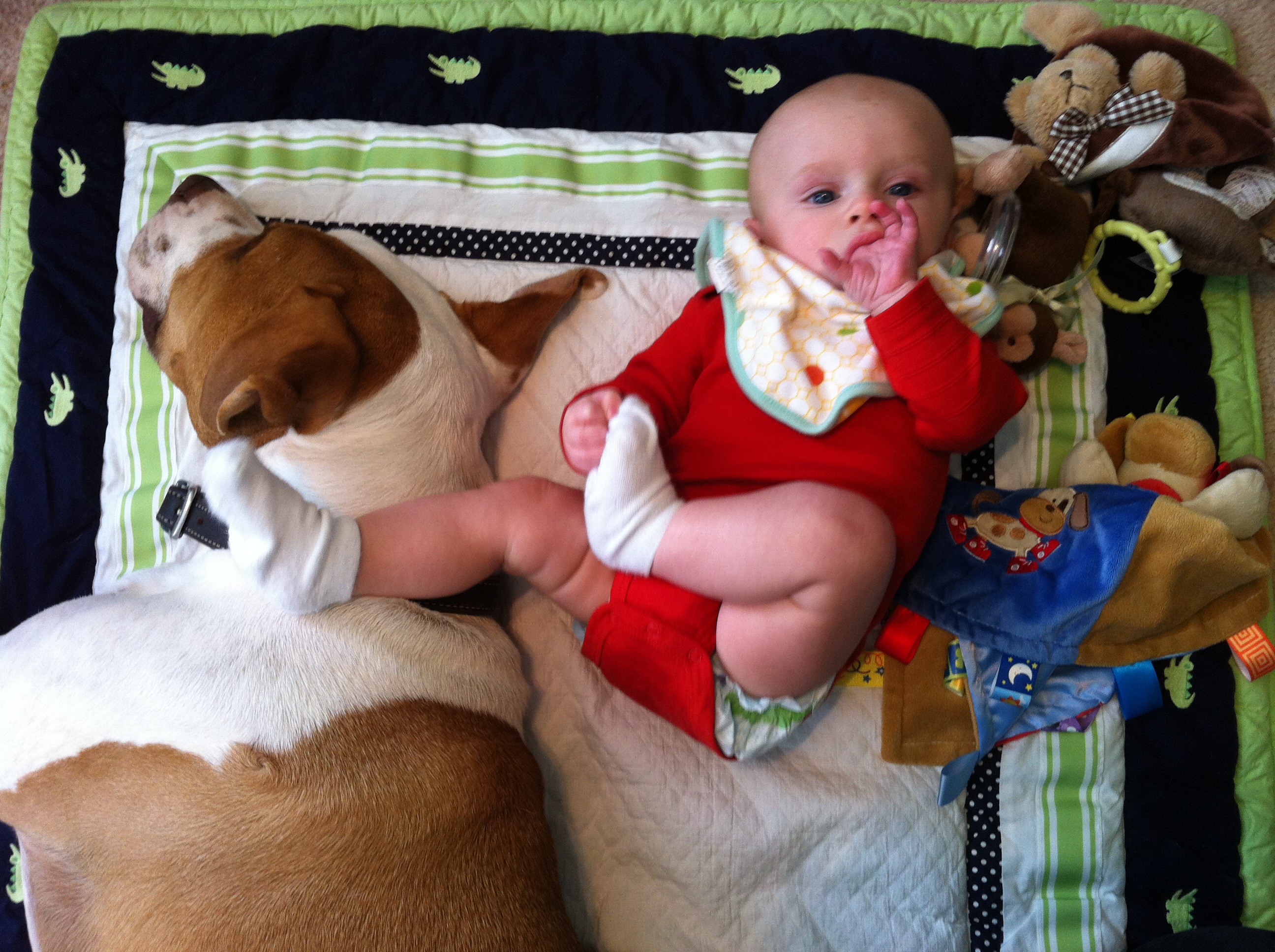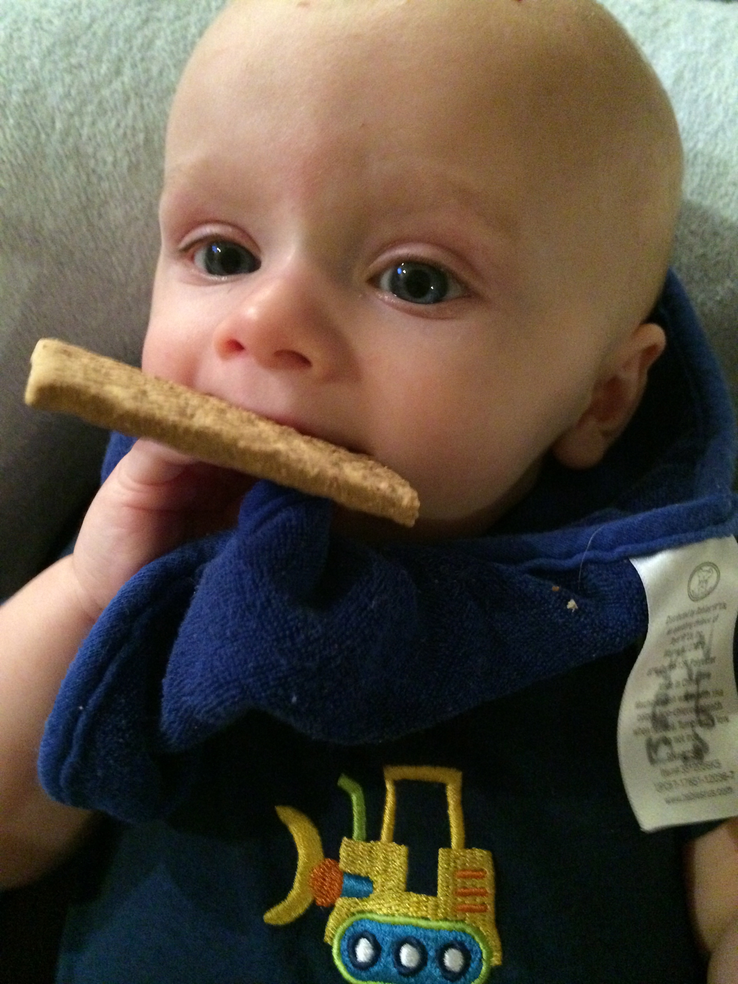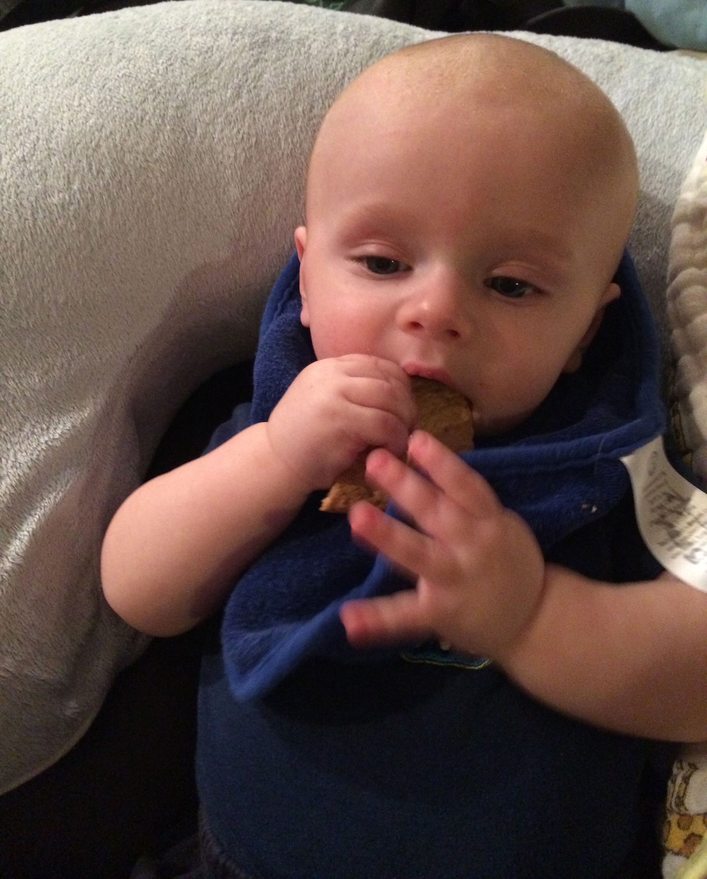 Also, he is cutting a tooth on the bottom… it’s not out yet, but I can see it has started. He also keeps grabbing at his lower gum line. I had to give him tylenol this week for the first time ever. He doesn’t dislike his teething toys, but his attention span for them is like 5 seconds.